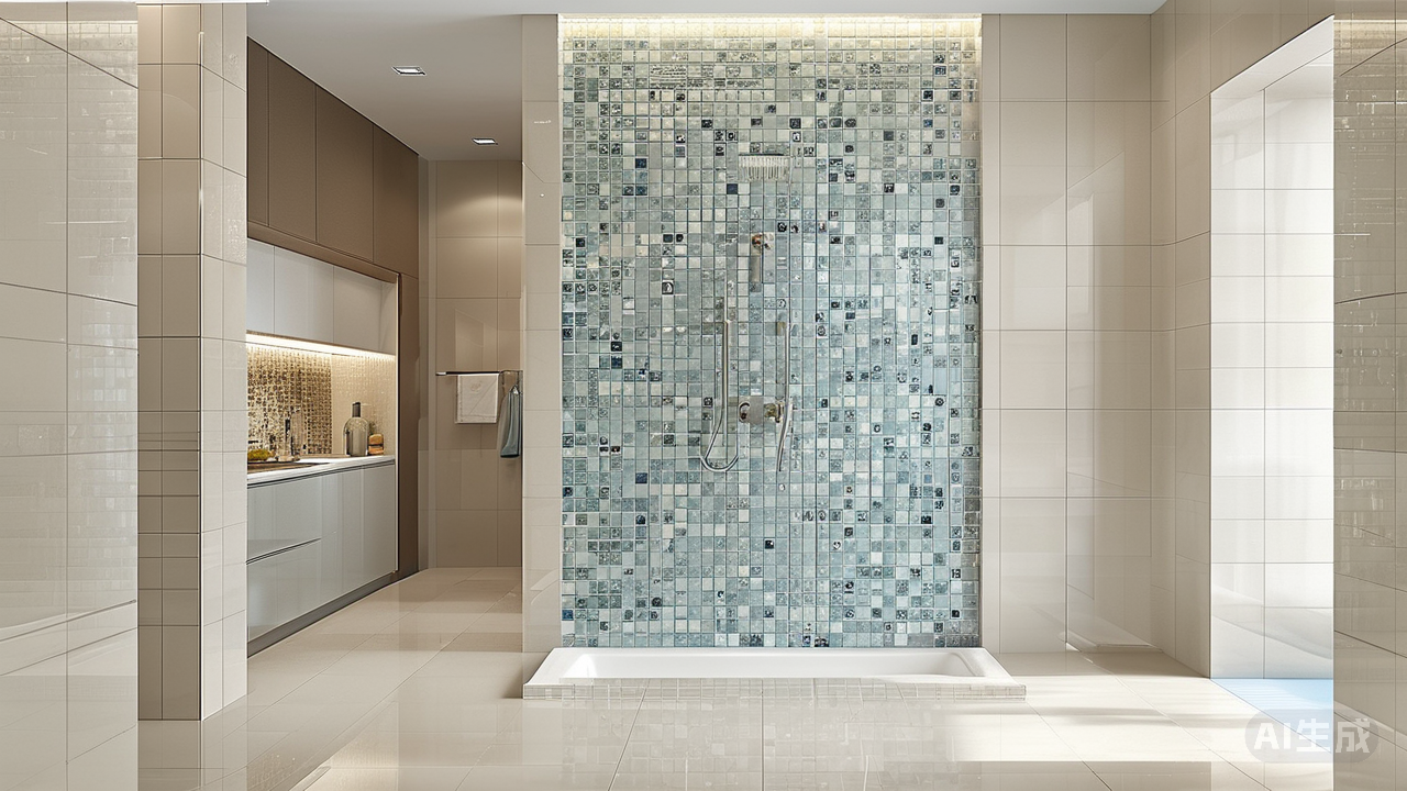 浅色系(米白、浅灰、淡蓝)为主,营造洁净明亮感,缓解潮湿压抑。可局部点缀花砖或马赛克作淋浴区背景墙点睛,但勿满铺。