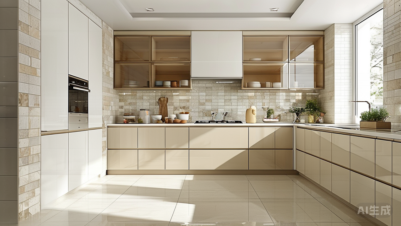 墙面浅色(白色、米黄)提亮操作区;地面选中性色(浅灰、米黄)或带细微斑点花纹的瓷砖,巧妙隐藏食物碎屑和污渍。避免纯白地面。
