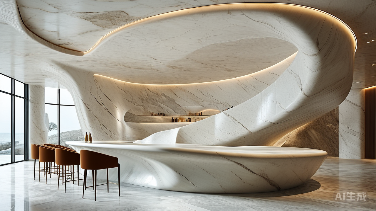 超越装饰,定义结构:自由无限连纹通体大理石的革命性突破装饰石材曾经背负着沉重的锁链:天然纹理的稀缺珍贵,却终被有限的尺寸所斩断;拼接痕迹如疤痕横亘,让设计师的宏大构想处处受限;冰冷的表面浮华,亦无法改变其仅作为薄层贴面的实质。大理石,这亿万年的杰作,长久被囚于装饰的牢笼。 而今,一场静默的革命正悄然改变着空间的筋骨与面容——自由无限连纹通体大理石终于问世。此突破并非仅囿于形式美学的精进,它一举撼动了石材应用的深层逻辑。 无限连纹:超越尺寸的诗意。技术突破解开了天然纹理与物理边界的古老矛盾,让瑰丽的花纹如江河奔涌,无惧切割,始终连贯。墙面整体不再是碎片拼凑的“蒙太奇”,而成为一片浑然天成的壮丽图卷。设计师自此握有了挥洒宏大叙事的画笔,一个楼层乃至整座建筑,都能被同一脉流动的天然之美温柔包裹。 通体材质:结构与灵魂的合一。通体技术赋予石材以深刻的统一性——表面纹理并非浮光掠影,而是贯穿整个材料的生命印记。当石材被切割、倒角、异形雕琢,露出的断口不再是苍白突兀的“伤口”,而是同一纹理在三维空间中的自然延伸。这不仅使空间构造获得了前所未有的整体性与深度,更在根本上模糊了装饰与结构、表皮与内核的僵硬边界,令每一处细节都焕发源自材料本真的气质。 这场革命早已催生出空间形态的蜕变。整体墙面无需再为接缝妥协,磅礴气势扑面而来;环形吧台与曲面楼梯流畅如雕塑,纹理如时光环绕,浑然一体;超大岛台与桌面如大地切片,纹理完整流淌,令人屏息。空间,不再是材料的容器,而成了大理石自身生命的自然延展场域。