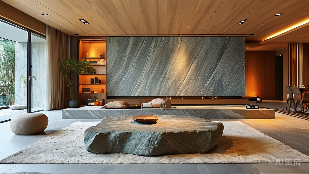 这方寸之间的优势首先体现在它对空间的视觉拉伸上。与传统的正方形或较小规格瓷砖不同,其修长的1500mm尺度恰如优雅的指挥棒,能精确引导视线纵向延展,轻松化解中小户型的局促感。当纵向铺贴时,墙面与地面仿佛自然衔接,形成完整连续的视觉纵深,令空间如呼吸般自由扩展。 更令人心动的是那显著减少的拼合缝隙。相较600x1200mm瓷砖,750x1500mm在同样面积下可减少约50%的缝隙数量。当这些细密的黑色切割线被最大程度“隐藏”后,整个地面便趋于浑然一体——客厅地面犹如一整块温润的巨石自然延展,纹理连贯流淌,从视觉上彻底抹除空间中的琐碎与割裂。