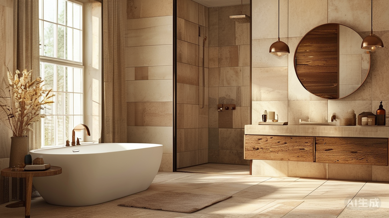 然而,冬日清晨走进这般浴室,寒意也许不请自来。这时不妨借灯光的暖意调和:在冷色基底上,一盏柔和黄铜吊灯或壁灯悄然点亮,便如同在冰薄荷的舌尖上融开一粒蜜糖,冷峻中透出温存,清冽而不孤寒。 暖色调则是黄昏时分的慵懒私语。米黄、浅褐或柔和的肉桂粉瓷砖拥抱着空气,阳光仿佛被温柔地留在了墙壁上,空间里弥散着松软面包般的暖香,隔绝了外界的喧哗。若再配上木质纹理的浴室柜,或者古铜色的龙头花洒,暖意便悄然叠加,如烛光里的低语,将紧绷的神经一寸寸抚平。尤其当北向浴室缺乏阳光时,暖色调便成了天然的“补光者”,空间不再阴郁,而流动着暖煦的呼吸。